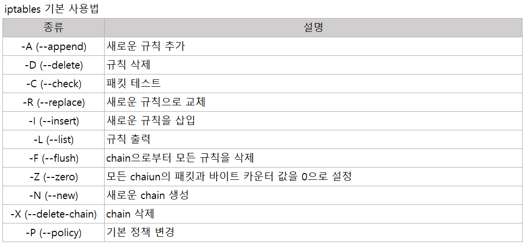 - 쉽게, iptables에서 table은 iptalbes의 기능을 큰 범주로 구분해 놓은 것이며,