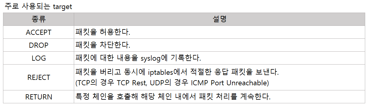 - 조건으로 설정한 규칙과 일치함은 매치에 설정된 모든 내용이 일치함을 의미하며, 수행하는 동작은 패킷을 허용(ACCEPT)하거나 차단(DROP)하는 iptables에서 처리될 최종 행위를 의미한다.