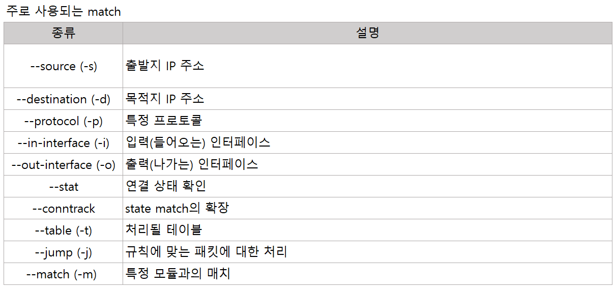 - iptables에서 패킷을 처리할 때 패킷이 만족해야 하는 조건을 가리킨다. 즉, 이 조건을 만족시키는 패킷에만 규칙을 적용한다.